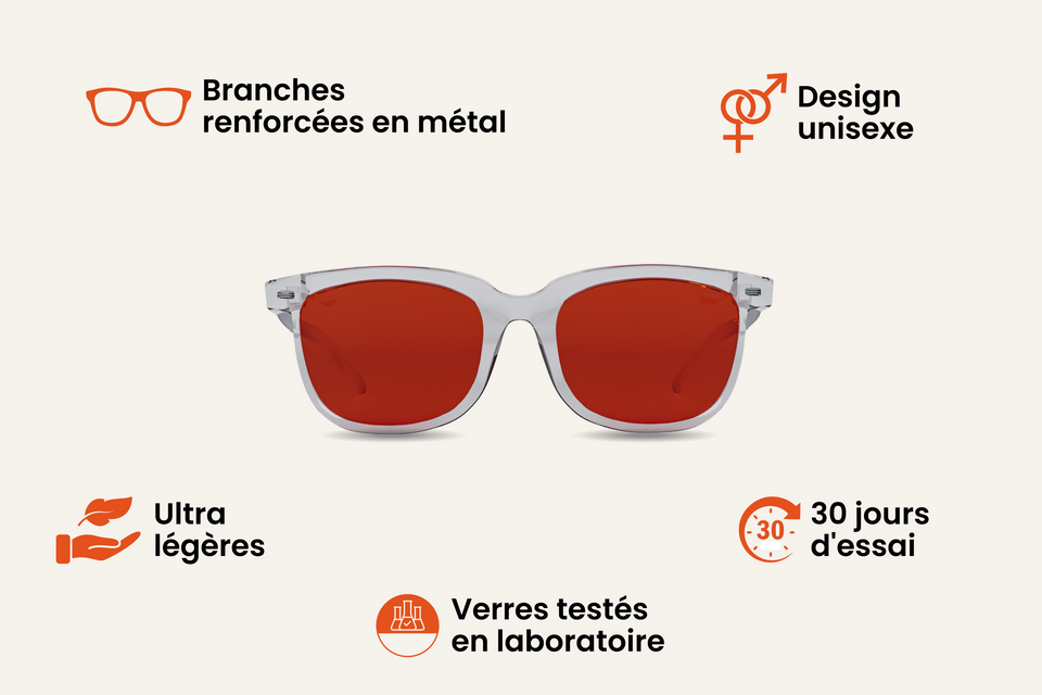 Nos lunettes filtrent la lumière bleue pour favoriser la mélatonine et améliorer votre bien-être.
