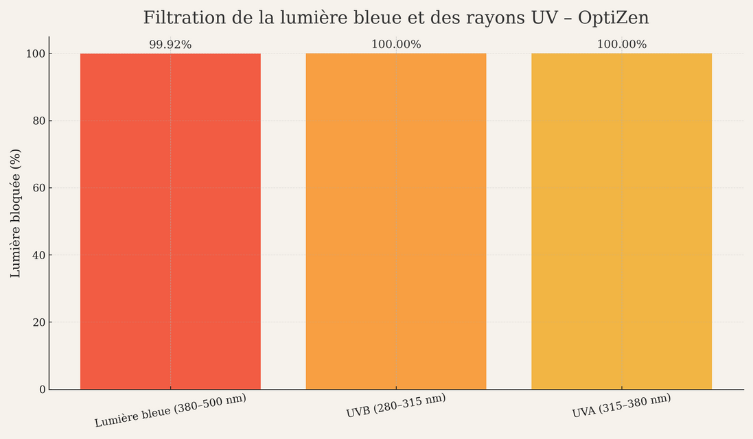 Nos verres rouges OptiZen 8009 sont testés en laboratoire selon les normes EN/ISO 12312-1, ANSI Z80.3 et AS/NZS 1067. Ils offrent une filtration exceptionnelle de la lumière bleue pour protéger votre santé visuelle et votre sommeil.